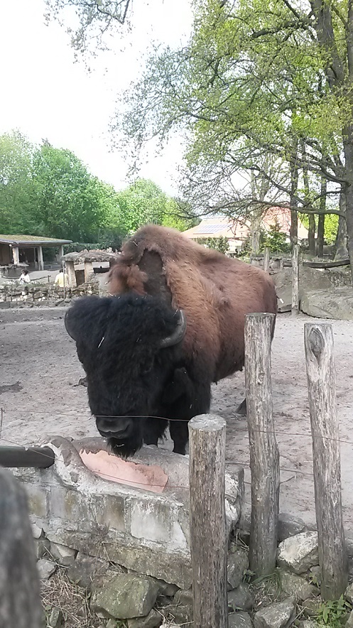 Okee, dat is té flauw... We kwamen wel deze bison tegen en het lijkt op de foto mee te vallen, maar dat beest is echt héél groot. Die kop is zo massief en ik schat dat hij in de hoogte toch zeker wel aan de 1.80 meter komt.