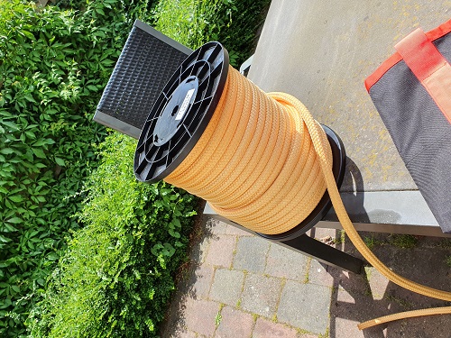 Zo'n lijn is met een breeksterkte van bijna 8000 kg ontworpen om takken mee uit een boom te laten zakken, of ik kan de lijn gecombineerd met een aantal slings inclusief karabijnen die ik eerder deze week al binnen had gekregen gebruiken als ziplijn waarbij de lijn dient als soort van kabelbaan. De slings maak je vast aan de tak, de karabijn gaat om de afvanglijn en zo kan een tak dan langs de lijn naar beneden glijden.