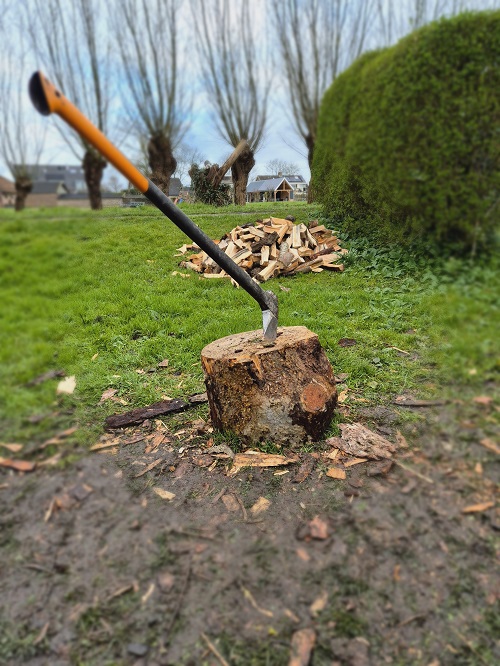 Kloven doe ik tot nu toe eigenlijk altijd handmatig met een kloofbijl. Dat geeft me de meeste voldoening en het klinkt misschien vreemd, maar dat is zowel fysiek als mentaal. Wat beweging kan sowieso nooit kwaad, maar als je mentaal gezien je kop leeg hebt voelt dat ook bijzonder prettig en het kloven van hout met de hand is voor mij persoonlijk wat dat betreft een wondermiddel.