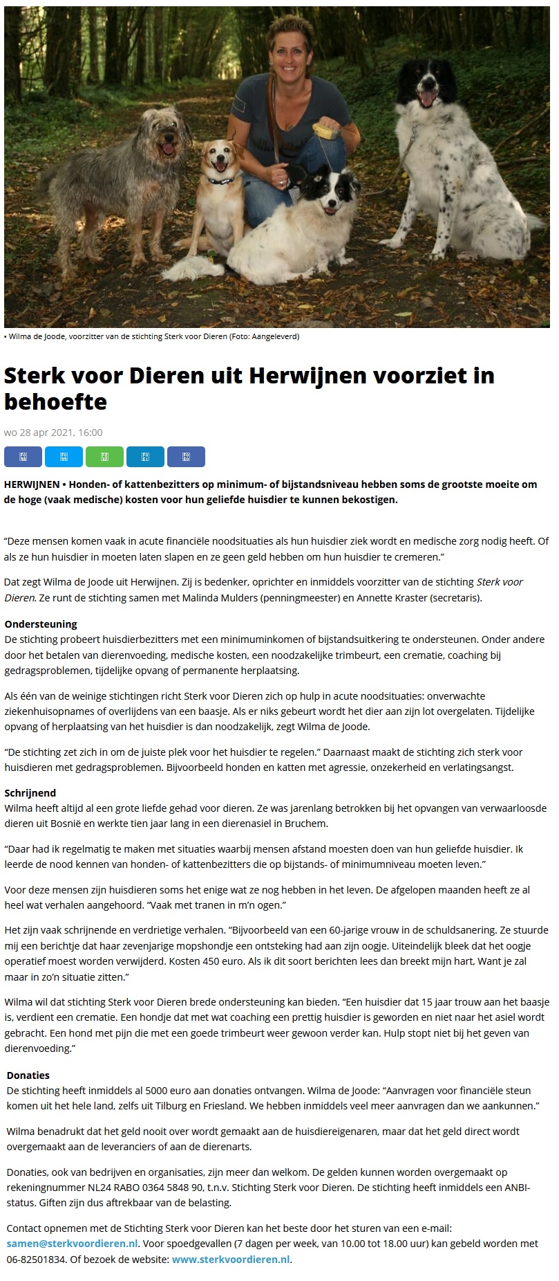 Geld is in die zin érg belangrijk, maar omdat ik meer van de praktische kant ben heb ik haar benaderd en mezelf aangeboden als vrijwilliger om als het nodig is hier of daar spullen voor haar op te halen en eventueel door te brengen naar de mensen en dieren die het zo hard nodig hebben. En geloof me... de hulp komt echt op plaatsen terecht waar die héél hard nodig is. Voor meer informatie kun je dit artikel even lezen wat in de lokale krant Het Kontakt stond. Het artikel zal openen als afbeelding in een nieuw scherm en mogelijk moet je even inzoomen. Voor meer info en eventueel een donatie kun je natuurlijk terecht op de eigen website van de stichting.