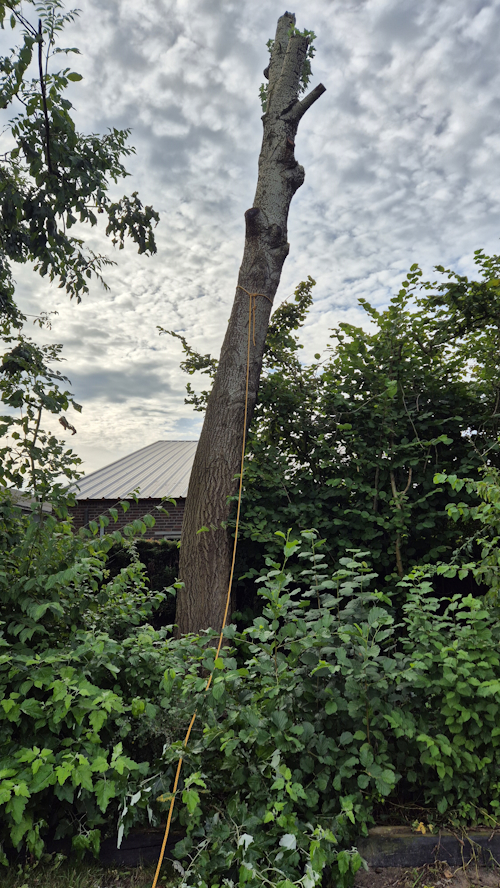 Dit is een restant van een eerder klus waar de eigenaar niet ineens met te veel hout wilde komen te zitten wat hij moest gaan verwerken, dus werd er gekozen om alles in delen te doen. Er staan nog 3 andere bomen op de lijst, maar inmiddels stonden die op de lijst. Alle 4 de bomen zouden tijdelijk als soort van totempaal blijven staan om later definitief geveld te worden. Ze waren te hoog en er was een behoorlijk risico op uitbrekende takken. Die takken zijn allemaal verwijderd, alleen zijn er 3 van de 4 weer mooi uit gaan lopen en omdat de risico's geminimaliseerd zijn is er voor gekozen die bomen lekker hun gang te laten gaan.